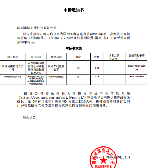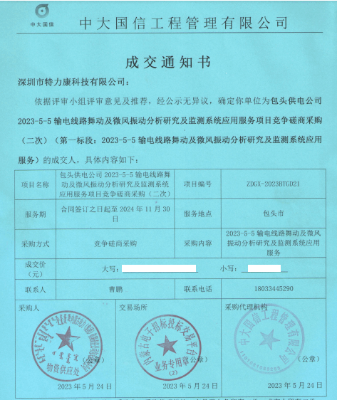 特力康中標國網黑龍江送變電工程公司的2024年度第18次物資類競爭性談判采購項目——慶陽驅鳥器物資框 特力康中標國網甘肅省電力公司省管產業單位2024年第五次物資競爭性談判授權采購項目 中標喜訊:深圳市特力康科技有限公司成功入圍許繼集團綜合能源公司輸電線路視頻在線監測裝置模塊集采項目 中標喜訊:特力康成功中標國網重慶市電力公司渝中一片區項目 特力康成功中標國網天津市電力公司2024年第二次?物?資招標項目 特力康中標國網安徽省電力有限公司蕪湖供電公司2024年3月非物質采購項目 破解巡檢難題:貴州電力用特力康 AI 微拍裝置,精準捕捉線路隱性隱患 精準捕捉 “微氣象”:浙江電力用特力康預警系統筑牢電網氣候防線 守護 “電力咽喉”:湖南電力投用百套特力康三跨 4G 監控球,筑牢安全防線 貴州電力裝特力康電網架空線路覆冰監測系統,精準防冰保電網過冬? 百套落地山西電網!特力康輕量化輸電架空線路監拍裝置,筑牢輸電安全網 破解采空區隱患:山西電力裝特力康通用型監測裝置,守鐵塔穩運行 寧夏配電線路安裝了我司防外破電子化智能警示牌