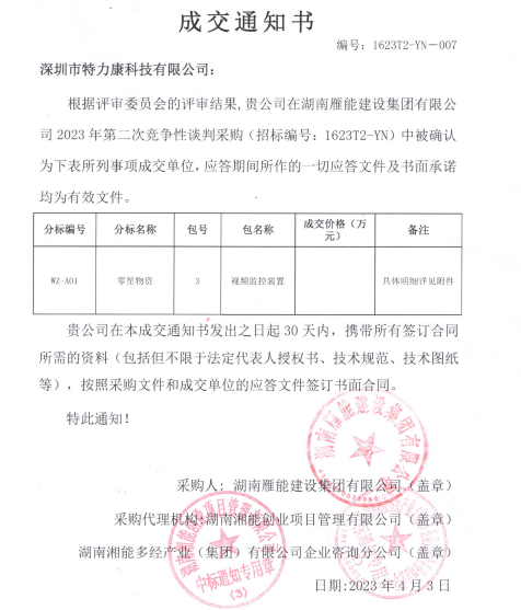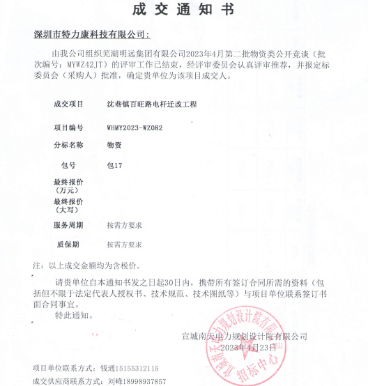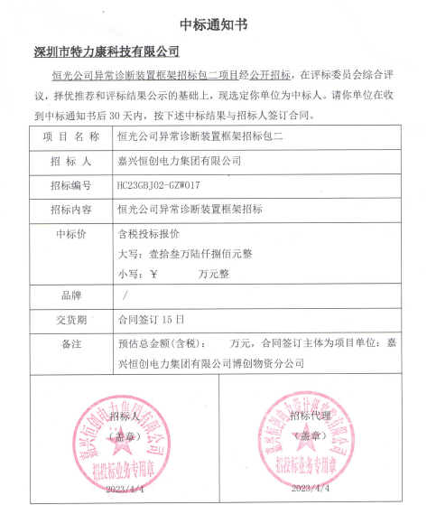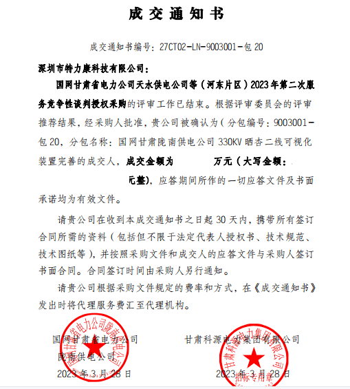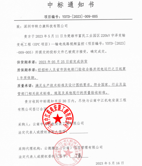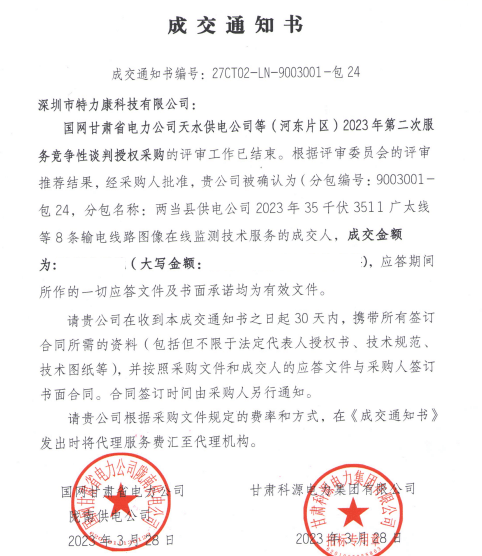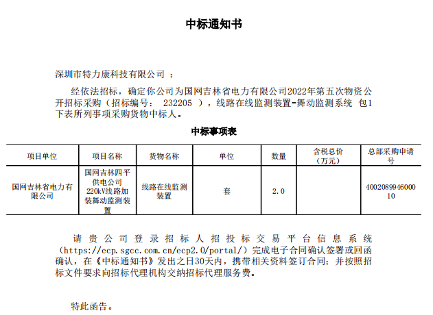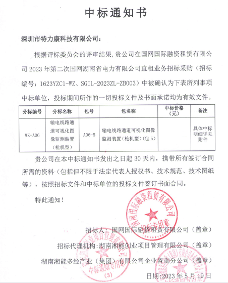 特力康中標國網黑龍江送變電工程公司的2024年度第18次物資類競爭性談判采購項目——慶陽驅鳥器物資框 特力康中標國網甘肅省電力公司省管產業單位2024年第五次物資競爭性談判授權采購項目 中標喜訊:深圳市特力康科技有限公司成功入圍許繼集團綜合能源公司輸電線路視頻在線監測裝置模塊集采項目 中標喜訊:特力康成功中標國網重慶市電力公司渝中一片區項目 特力康成功中標國網天津市電力公司2024年第二次?物?資招標項目 特力康中標國網安徽省電力有限公司蕪湖供電公司2024年3月非物質采購項目 破解巡檢難題:貴州電力用特力康 AI 微拍裝置,精準捕捉線路隱性隱患 精準捕捉 “微氣象”:浙江電力用特力康預警系統筑牢電網氣候防線 守護 “電力咽喉”:湖南電力投用百套特力康三跨 4G 監控球,筑牢安全防線 貴州電力裝特力康電網架空線路覆冰監測系統,精準防冰保電網過冬? 百套落地山西電網!特力康輕量化輸電架空線路監拍裝置,筑牢輸電安全網 破解采空區隱患:山西電力裝特力康通用型監測裝置,守鐵塔穩運行 寧夏配電線路安裝了我司防外破電子化智能警示牌