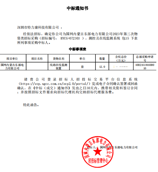 特力康中標國網內蒙古東部電力有限公司2023年第二次物資類招標采購