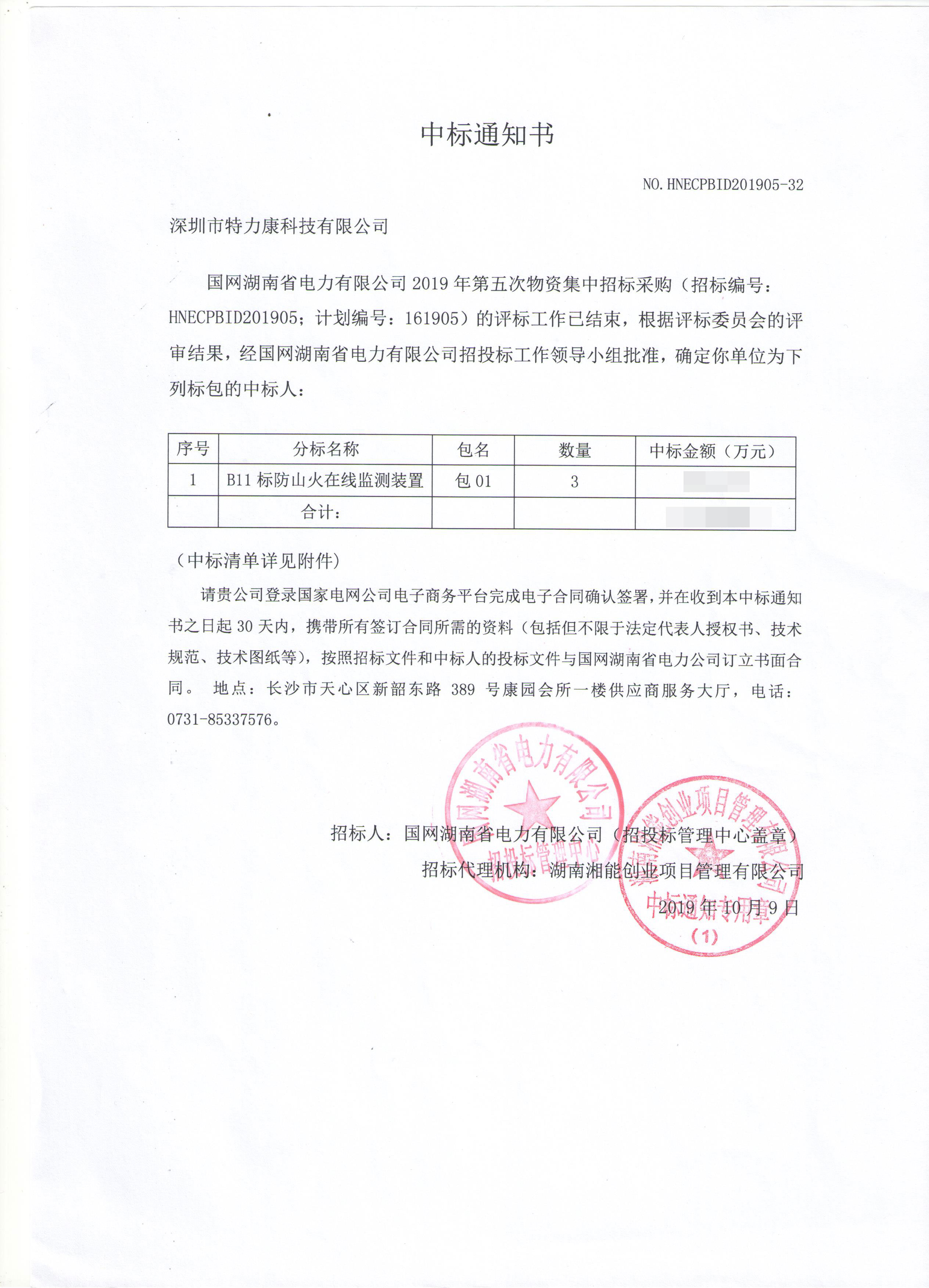 國網湖南省電力有限公司2019年第五次物資集中招標輸電線路防山火監測裝置的評標工作已結束,根據評標審結果,經國網湖南省電力有限公司招投標工作領導小組批準,確定我司深圳市特力康科技有限公司為列標包的中標人。